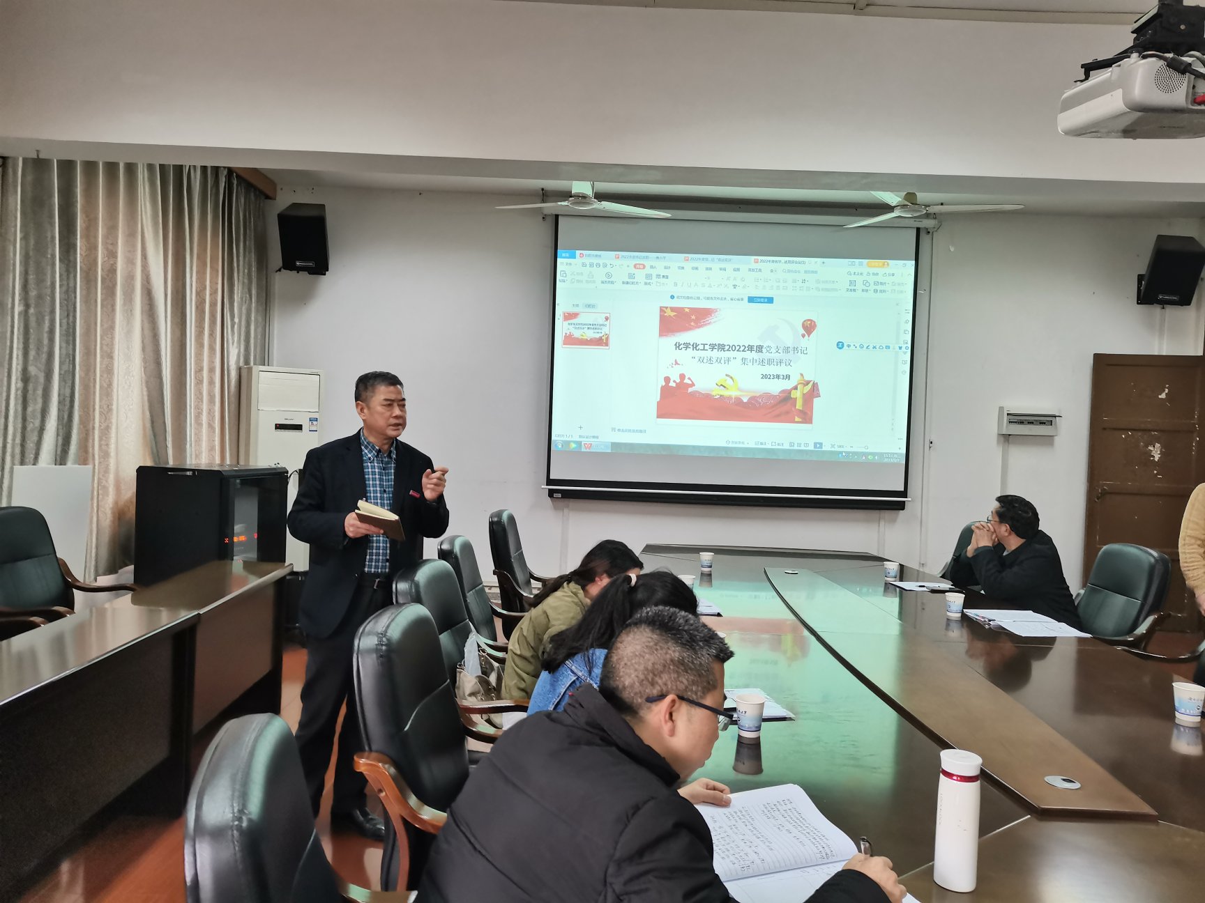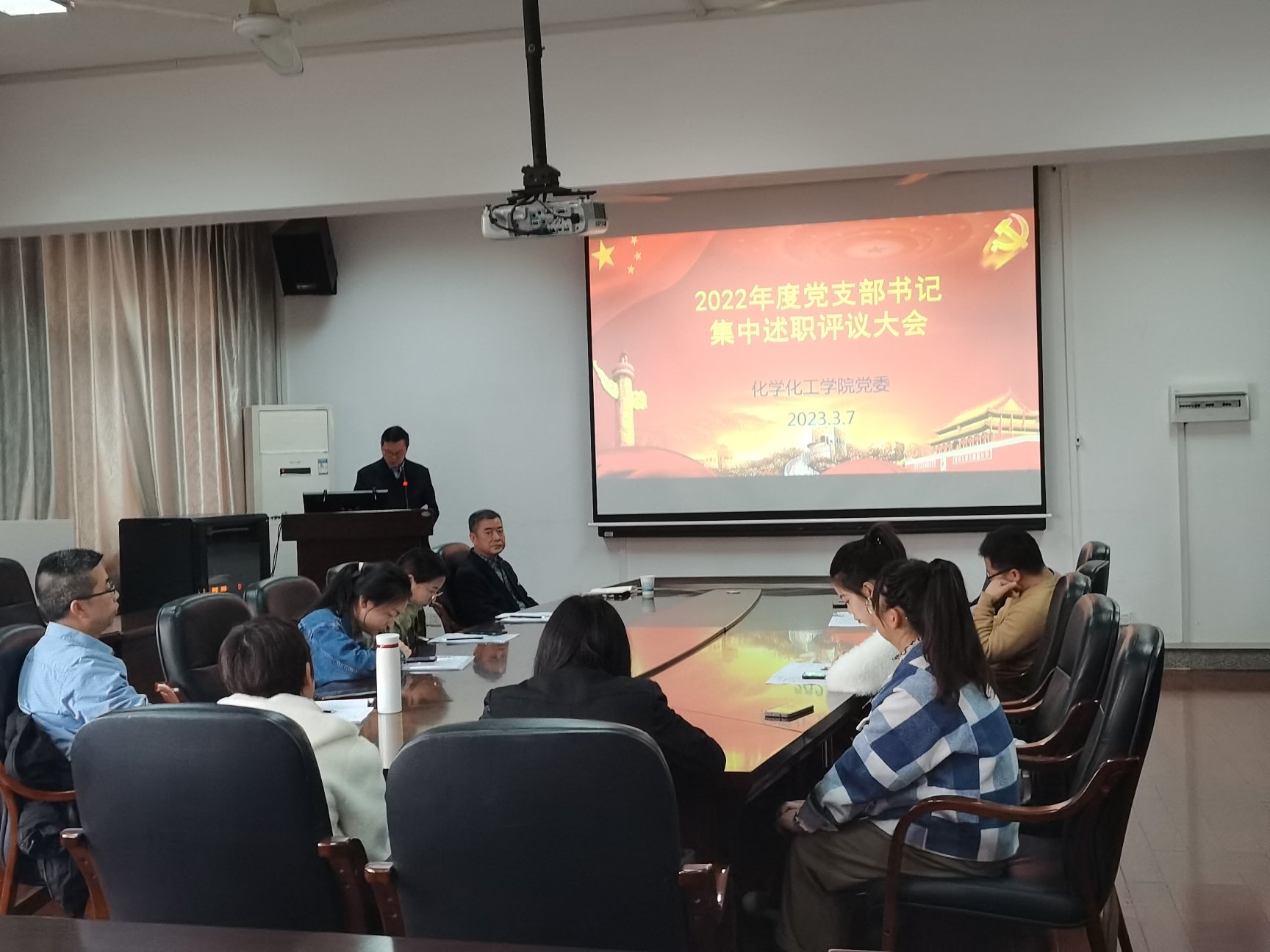 学院教工各党支部、本科生各党支部、研究生各党支部等11个党支部书记围绕学习贯彻习近平新时代中国特色社会主义思想和党的二十大精神、落实基层党建责任制和基层党建重点任务、联系服务师生、廉洁自律等情况依次进行述职。学院党委书记周文革对各位支部书记述职进行点评,他在肯定工作特色与亮点的同时,指出了各支部在党建工作中存在的问题与不足,并提出改进意见与建议。述职结束后,与会人员对支部书记进行评议测评。